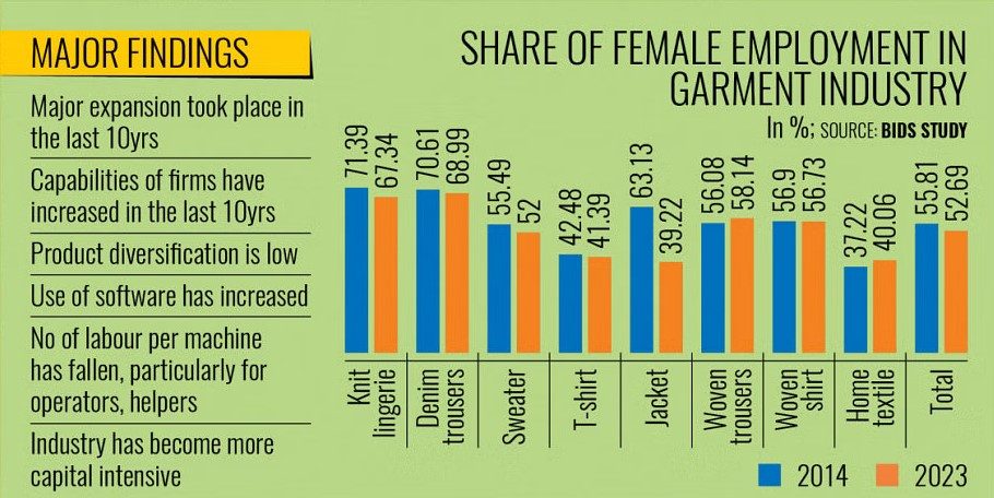 ২০১৪ সালে নারী শ্রমিকের হার ছিল ৫৬%, ২০২৩ সালে নেমে দাঁড়িয়েছে ৫৩%। আইএলও-র হিসাবে এখন ৪.২ মিলিয়ন পোশাক শ্রমিকের মধ্যে প্রায় ৬০% নারী, তবে এই হারও ধীরে ধীরে কমছে।