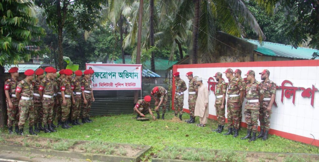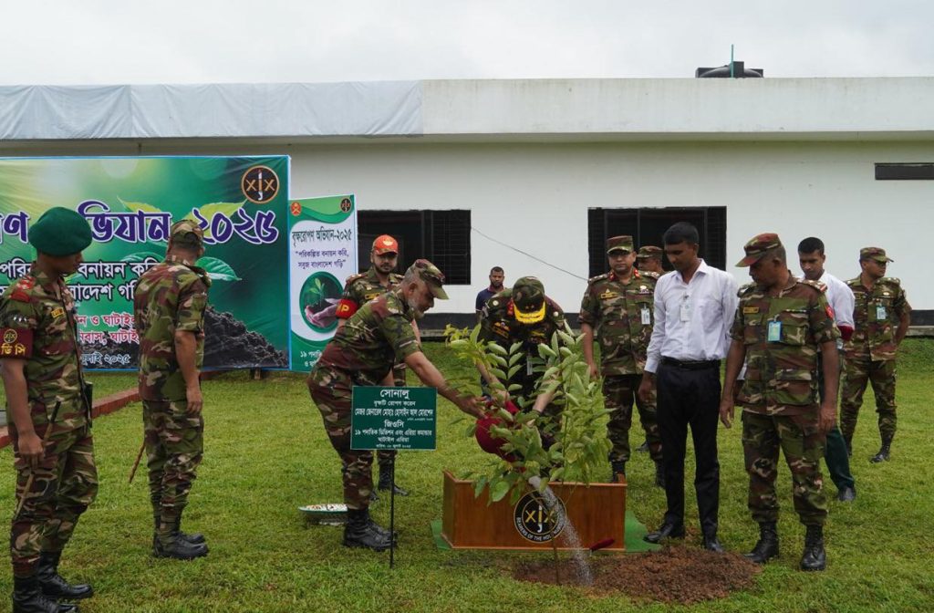 চট্টগ্রাম অঞ্চলে বাংলাদেশ সেনাবাহিনীর বৃক্ষরোপন কর্মসূচি- ২০২৫ এর অংশ হিসেবে ফলজ ও বনজ চারা রোপনের দৃশ্য