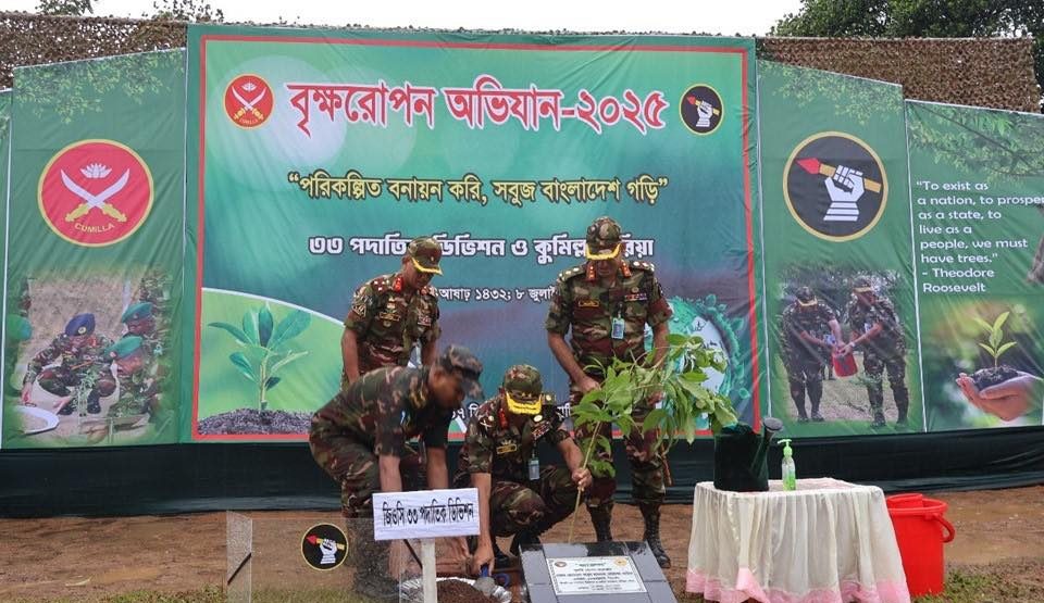 ‘পরিকল্পিত বনায়ন করি, সবুজ বাংলাদেশ গড়ি’ এই প্রতিপাদ্যে বাংলাদেশ সেনাবাহিনীর বৃক্ষরোপণ অভিযান-২০২৫ এ সকল সেনানিবাসের প্রশিক্ষণ ও ফায়ারিং রেঞ্জ এলাকা, ডিওএইচএস এবং জলসিঁড়ি আবাসন প্রকল্পে ফলজ, বনজ ও ঔষধি প্রজাতির বৃক্ষসহ সৌন্দর্য্যবর্ধক গাছের চারা রোপণের মাধ্যমে এই বৃক্ষরোপন কর্মসূচী একযোগে বাস্তবায়ন করা হবে, যা সেপ্টেম্বর ২০২৫ পর্যন্ত চলমান থাকবে।