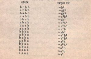 এখন যেহেতু প্রতিষ্ঠা ছন্দের ৪টি অক্ষর অতএব আমরা উপরোক্ত পরিকল্পনা (a+b)4 এর বিস্তৃতি থেকে পেতে পারি। মনে রাখা প্রয়োজন এখানে a=লঘু, b=শুরু ধরা হয়েছে। b4 , b²a প্রভৃতিকে সাজিয়ে লেখবার এবং এ সম্পর্কে ব্যাপক আলোচনার জন্য পিঙ্গল মেরু প্রস্তাবের কথা বলেছেন আমরা “সমবায় ও বিন্যাসে” এ নিয়ে দীর্ঘ আলোচনা করেছি। তবুও এখানে মেরু প্রস্তাবের সঙ্গে দ্বিপদ উপপাদ্যের সম্পর্ক দেখানোর জন্য ছবিটি আবার তুলে ধরা হোল।