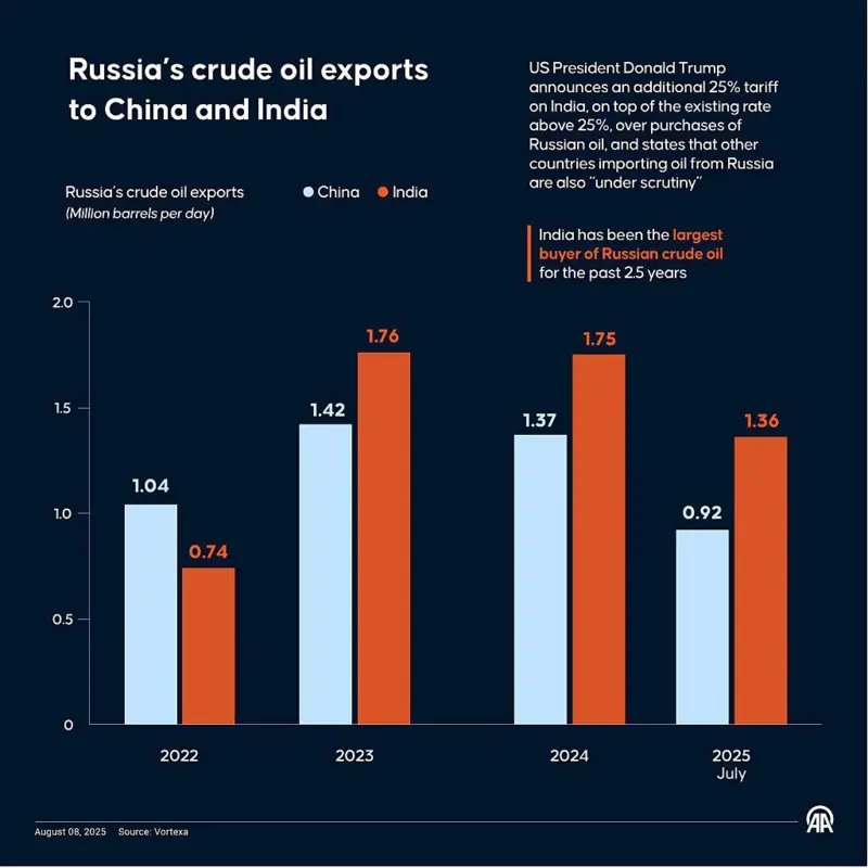 গত তিন-চার বছরের মধ্যে রাশিয়া ভারতের জন্য প্রধান ক্রুড (অপরিশোধিত তেল) সরবরাহকারী দেশ হয়ে উঠেছে – এবং প্রেসিডেন্ট ট্রাম্প ভারতের ওপর যে তথাকথিত ‘রাশিয়া পেনাল্টি’ চাপিয়েছেন, তারও ঘোষিত কারণ এটাই।