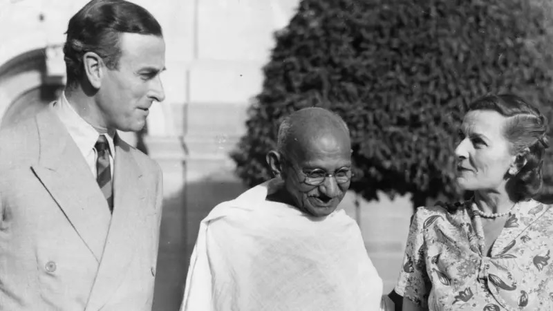 মোহনদাস করমচাঁদ গান্ধী (মাঝে), বাঁয়ে লর্ড ও ডাইনে লেডি মাউন্টব্যাটেন