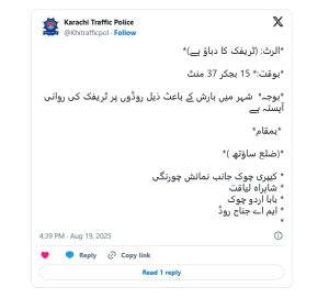 করাচি ট্রাফিক পুলিশের বিকেল ৩টা ৩৭ মিনিটের হালনাগাদ তথ্যে বলা হয়, দক্ষিণ জেলার ক্যাপ্রি চক-নুমায়েশ চৌরঙ্গি, লিয়াকত হাইওয়ে, বাবা উর্দু চক, এমএ জিন্নাহ রোডসহ একাধিক গুরুত্বপূর্ণ সড়কে যানজট তৈরি হয়।