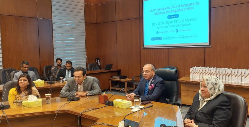 বাংলাদেশের সুপ্রিম কোর্টে গিয়ে প্রধান বিচারপতি সৈয়দ রেফাত আহমেদের সঙ্গে সাক্ষাতের সুযোগ পেল ৩০ জন কিশোরী। ব্র্যাকের সামাজিক ক্ষমতায়ন ও আইনগত সুরক্ষা কর্মসূচির (সেলপ) উদ্যোগ ‘স্বপ্নসারথি’-এর সদস্য এই কিশোরীরা আজ বৃহস্পতিবার, ২১শে আগস্ট ২০২৫ তারিখে সুপ্রিম কোর্ট প্রাঙ্গণ ঘুরে দেখেছে। প্রতিকূল বাস্তবতার মধ্যেও এই কিশোরীদের স্বপ্ন ভবিষ্যতে আইন পেশায় যুক্ত হওয়ার। প্রধান বিচারপতির এই আমন্ত্রণ তাদের জন্য দেশের বিচার ব্যবস্থা সম্পর্কে প্রত্যক্ষভাবে জানার এক অনন্য সুযোগ করে দিয়েছে।