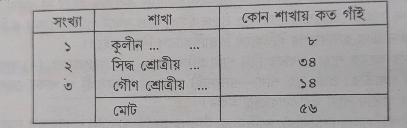 খ) রাঢ়ী ব্রাহ্মণ-পুত্রেষ্টি যাগ সম্পন্ন জন্য আদিশূর কান্যকুব্জ হইতে সাগ্নিক বেদজ্ঞ পঞ্চ গোত্রিয় পঞ্চ ব্রাহ্মণ বঙ্গদেশে আনেন। তাহাদের নাম দক্ষ, ভট্টনারায়ণ, শ্রীহর্ষ, বেদগর্ভও ছান্দড়। ইহাদের সন্তান সন্ততি কেহ রাঢ়দেশে এবং কেহ বরেন্দ্রভূমে বাস করেন। যাহারা রাঢ় দেশে বাস করেন, তাহারাই রাঢ়ী ব্রাহ্মণ হইলেন। কিন্তু হন্টার সাহেব বলেন, যে মহারাষ্ট্রীয়দের আক্রমণ সময় রাঢ়ীশ্রেণি ব্রাহ্মণেরা পশ্চিম বাঙ্গালা হইতে আসিয়া রাজসাহী জেলায় বাস করে। রাজসাহী বরেন্দ্রভূমি এবং হন্টার সাহেবের “পশ্চিম-বাঙ্গালা” বোধ হয় রাঢ়দেশ। এই দুই প্রদেশ পদ্মা নদী দ্বারা বিচ্ছেদ হইয়াছে। মহারাষ্ট্রীয়দের পক্ষে পদ্মানদী পার হইয়া রাজসাহী আক্রমণ করা কঠিন বিবেচনায়, পশ্চিমবাঙ্গালা হইতে রাঢ়ীশ্রেণি ব্রাহ্মণ যে রাজসাহীতে বাস নির্দেশ করেন, তাহা হন্টার সাহেবের অসঙ্গত কথা বলিয়া বোধ হয় না। কান্যকুব্জাগত পঞ্চ ব্রাহ্মণ মধ্যে দক্ষের ১৬, ভট্টনারায়ণের ১৬, শ্রীহর্ষের ৪, বেদগর্ভের ১২ এবং ছান্দড়ের ৮ সন্তান জন্মে। অতএব রাঢ়ীশ্রেণি ব্রাহ্মণেরা বলেন, “পঞ্চ গোত্র ছাপান্ন গাঁই তাহা ছাড়া ব্রাহ্মণ নাই।” বারেন্দ্রশ্রেণি ব্রাহ্মণের একশত গাঁই এবং ইহাদের আদিপুরুষ সুষেণ প্রভৃতি পঞ্চ ব্রাহ্মণ। ইহারাও কান্যকুব্জাগত পঞ্চ ব্রাহ্মণের সন্তান।” “কালক্রমে যখন ভ্রাতৃগণ মধ্যে অপ্রণয় ও বিদ্বেষ জন্মিল তখনই রাঢ়ী ও বারেন্দ্রগণ পরস্পর পৃথক হন। তৎকালে যাহারা পৃথক হইলেন, তাহারা পুনর্বার রাজার নিকট নিজ নিজ বাসের জন্য আরও কতকগুলি গ্রাম প্রাপ্ত হইলেন। সেই গ্রামগুলি বরেন্দ্রভূমের মধ্যে নির্দিষ্ট হইল। সুতরাং উহা রাঢ়দেশের ছাপান্ন গ্রাম নামমালার মধ্যে পরিগণিত হইতে পারে না।” রাঢ়ী শ্রেণি ব্রাহ্মাণগণের ৫৬ গাঁই মধ্যে আট গাঁই নবগুণ বিশিষ্ট এবং কুলীন বলিয়া প্রসিদ্ধ। যথা বন্দো, চট্ট, মুখুটি, ঘোষাল, পুতিত্বও, গাঙ্গুলি, কাঞ্জিলাল, কুন্দগ্রামী। এই আট বংশে সর্বসমেত উনিশ জন কুলীন হইলেন। ইহাদের অধস্তন সন্তানগণ মধ্যে পালধি, পাকড়াশি, বটব্যাল প্রভৃতি বংশগুলি অষ্টগুণবিশিষ্ট হওয়াতে শ্রোত্রিয় বলিয়া প্রসিদ্ধ হইল। আবার আদানপ্রদানে অসাবধান থাকায় দীর্ঘাঙ্গী, ঘন্টেশ্বরী প্রভৃতি বংশ গৌণ কুলীন বলিয়া পরিচিত হইল। এই রাঢ়ীশ্রেণি ব্রাহ্মহ্মগণের কোন শাখায় কত গাঁই তাহা নিম্ন তালিকায় জানা যাইবে।