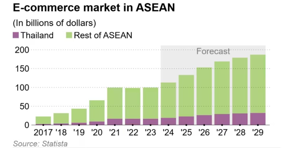 ২০২৫ সালে থাইল্যান্ডের ই-কমার্স বাজারের আকার ২২.৮ বিলিয়ন ডলারে পৌঁছাবে বলে ধারণা করা হচ্ছে, যা ২০২৯ সালে ৩২.২ বিলিয়ন ডলার হতে পারে। তবে বাজার ইতোমধ্যেই শপিই, লাজাদা ও টিকটক শপের দখলে—যারা যথাক্রমে ৫১%, ২৫% ও ২৪% শেয়ার নিয়েছে।