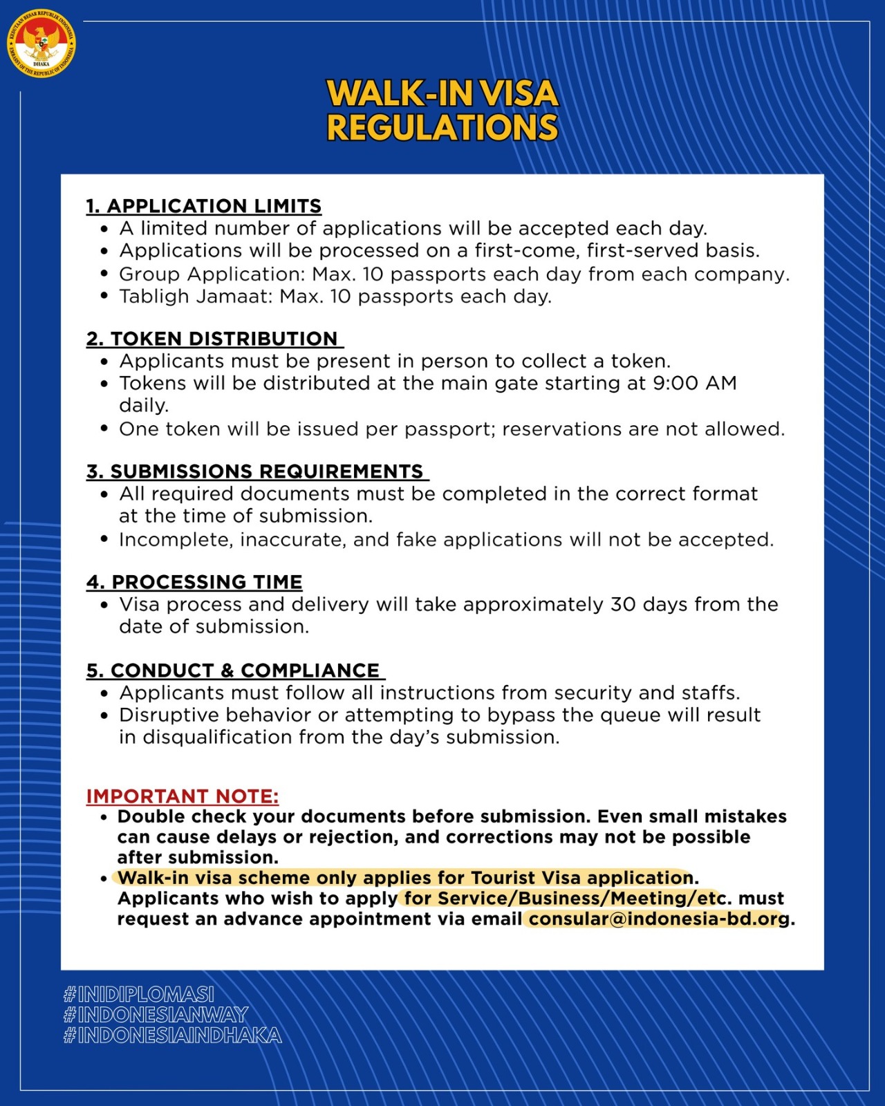 ঢাকায় অবস্থিত ইন্দোনেশিয়া দূতাবাস ১ সেপ্টেম্বর ২০২৫ থেকে একক প্রবেশাধিকার (C1) ট্যুরিস্ট ভিসার জন্য সাময়িক ওয়াক-ইন ব্যবস্থা চালু করেছে। রবিবার থেকে বৃহস্পতিবার সকাল ৯:০০–দুপুর ১২:০০ পর্যন্ত ওয়াক-ইন গ্রহণ করা হবে। মেইন গেটে টোকেন ইস্যু করা হবে; আবেদনকারীকে নিজে উপস্থিত থেকে টোকেন নিতে হবে। প্রতিটি পাসপোর্টের জন্য একটি টোকেন দেওয়া হবে এবং আগাম সংরক্ষণ সম্ভব নয়।
