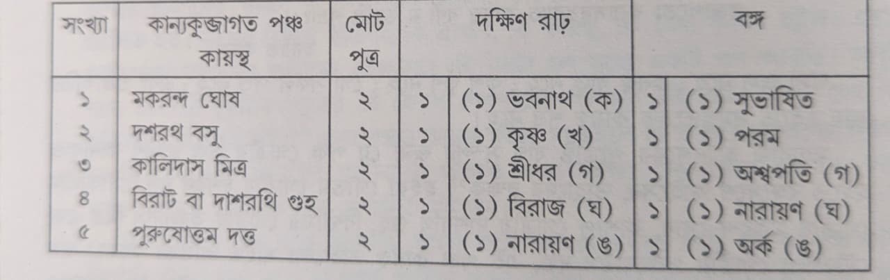 দক্ষিণ রাঢ়ী কায়স্থ কান্যকুব্জাগত পঞ্চ ব্রাহ্মণের সঙ্গে যে পঞ্চ কায়স্থ বঙ্গদেশে আইসেন, তাহাদের বংশধরগণ মধ্যে কেহ বঙ্গে এবং কেহ দক্ষিণ রাঢ়ে বাস করেন। যাহারা দক্ষিণ রাঢ়ে বাস করেন, তাহারাই দক্ষিণ রাঢ়ী কায়স্থ আখ্যা প্রাপ্ত হইলেন। এই পঞ্চ কায়স্থের অধস্তন সন্তানের কয়জন রাঢ়ে এবং কয়জন বঙ্গে বাস করেন, তাহারা তালিকা নিম্নে দেওয়া