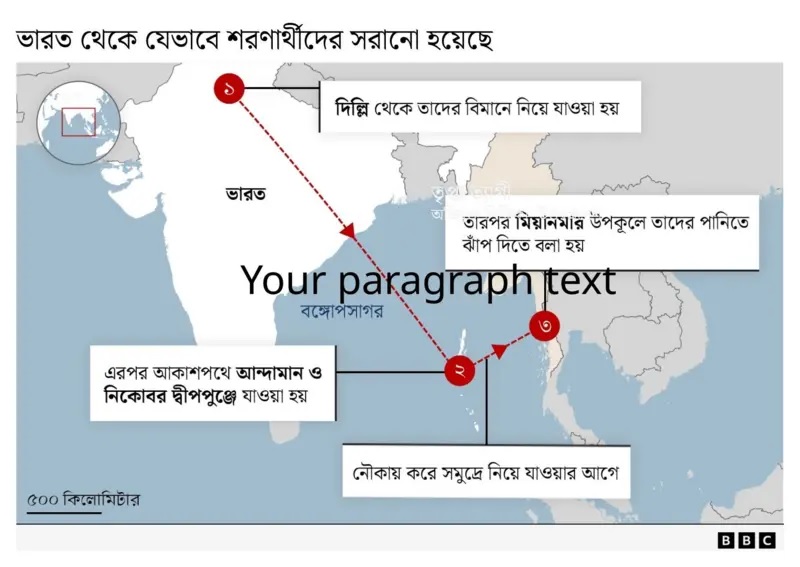 আমরা জানতে পেরেছি, তাদের দিল্লি থেকে আকাশ পথে বঙ্গোপসাগরের এক দ্বীপে আনার পর নৌবাহিনীর জাহাজে চাপিয়ে দেওয়া হয়। শেষে লাইফ জ্যাকেট পরা অবস্থায় আন্দামান সাগরে নেমে যেতে বাধ্য করা হয় তাদের। সেখান থেকে তীরে পৌঁছান তারা এবং এখন মিয়ানমারে অনিশ্চিত ভবিষ্যতের মুখোমুখি হতে হচ্ছে তাদের।