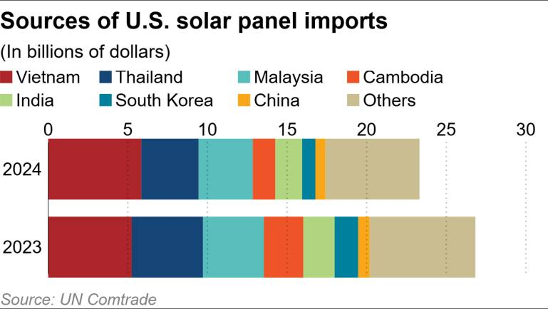 কিন্তু চলতি বছরের প্রথম ছয় মাসে সৌর রফতানি কমে দাঁড়িয়েছে মাত্র ৪.৪ মিলিয়ন ডলারে। যুক্তরাষ্ট্রের বাণিজ্য দপ্তর দাবি করেছে, কাম্বোডিয়া ও অন্যান্য দেশ চীন থেকে মডিউল এনে রফতানি করছে। তদন্তের আওতা সম্প্রসারিত হয়েছে মালয়েশিয়া, থাইল্যান্ড, ভিয়েতনাম ছাড়াও ইন্দোনেশিয়া, লাওস ও ভারতের দিকে।