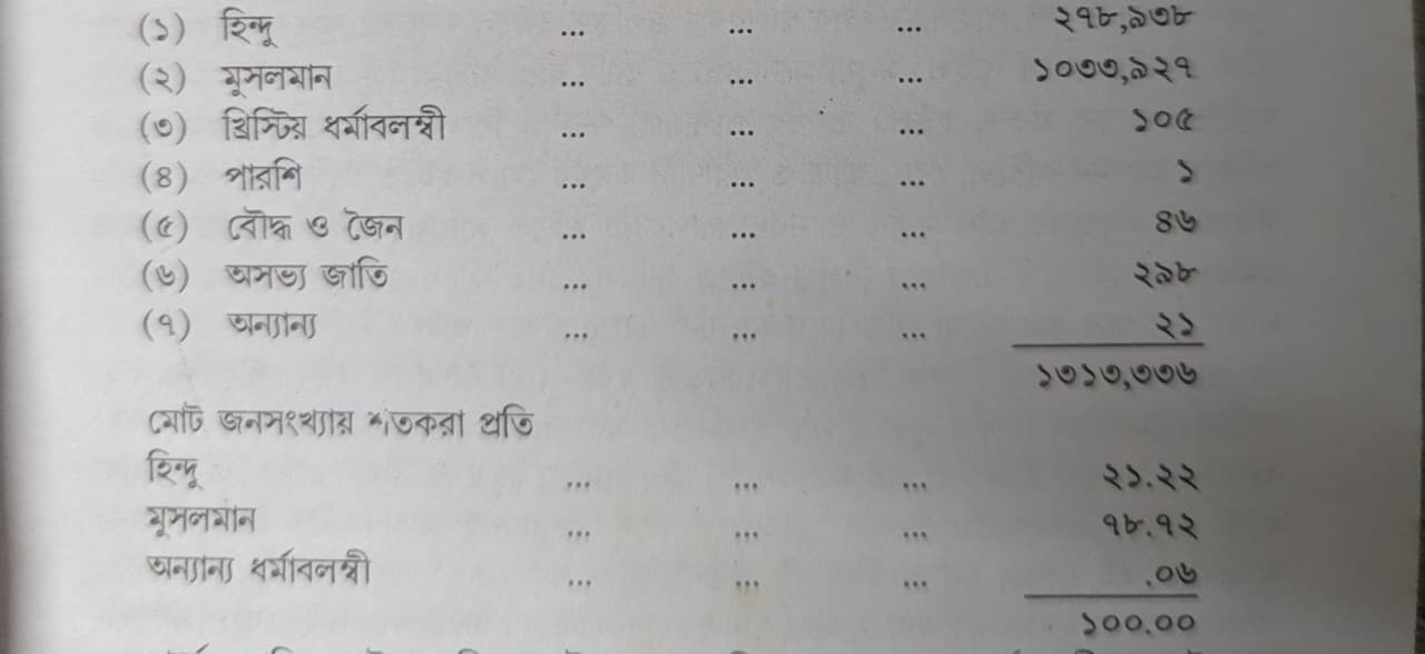 ১৮৭২ খ্রিস্টাব্দের জনসংখ্যা শতকরা ২১.৯ জন হিন্দু এবং ৭৭.৭ জন মুসলমান ছিল। এই বিংশতি বৎসরে হিন্দু ধর্মাবলম্বীর সংখ্যা কমিয়াছে এবং মুসলমান ধর্মাবলম্বীর সংখ্যা বেশি হইয়াছে। হিন্দু মুসলমান হইয়া যে সংখ্যা বৃদ্ধি হইয়াছে এমন নহে। স্থানে স্থানে ‘ম্যালেরিয়া’ দোষে ব্রাহ্মণ ভদ্রের অনেক বংশের ধ্বংস দেখা যাইতেছে। রাজসাহীর কৃষক মুসলমানদিগের অবস্থা উন্নত।