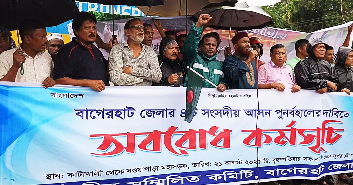 বুধবার বাগেরহাটে চারটি সংসদীয় আসন অক্ষুণ্ণ রাখার দাবিতে ৪৮ ঘণ্টার ধর্মঘটের প্রথম দিন নানা কর্মসূচির মধ্য দিয়ে পালিত হয়েছে। সকাল থেকে সড়ক অবরোধ, মিছিল, অবস্থান কর্মসূচি ও পথসভায় অংশ নেন সর্বদলীয় যৌথ কমিটির নেতাকর্মীরা। এতে সাধারণ মানুষের ভোগান্তি বেড়ে যায়।