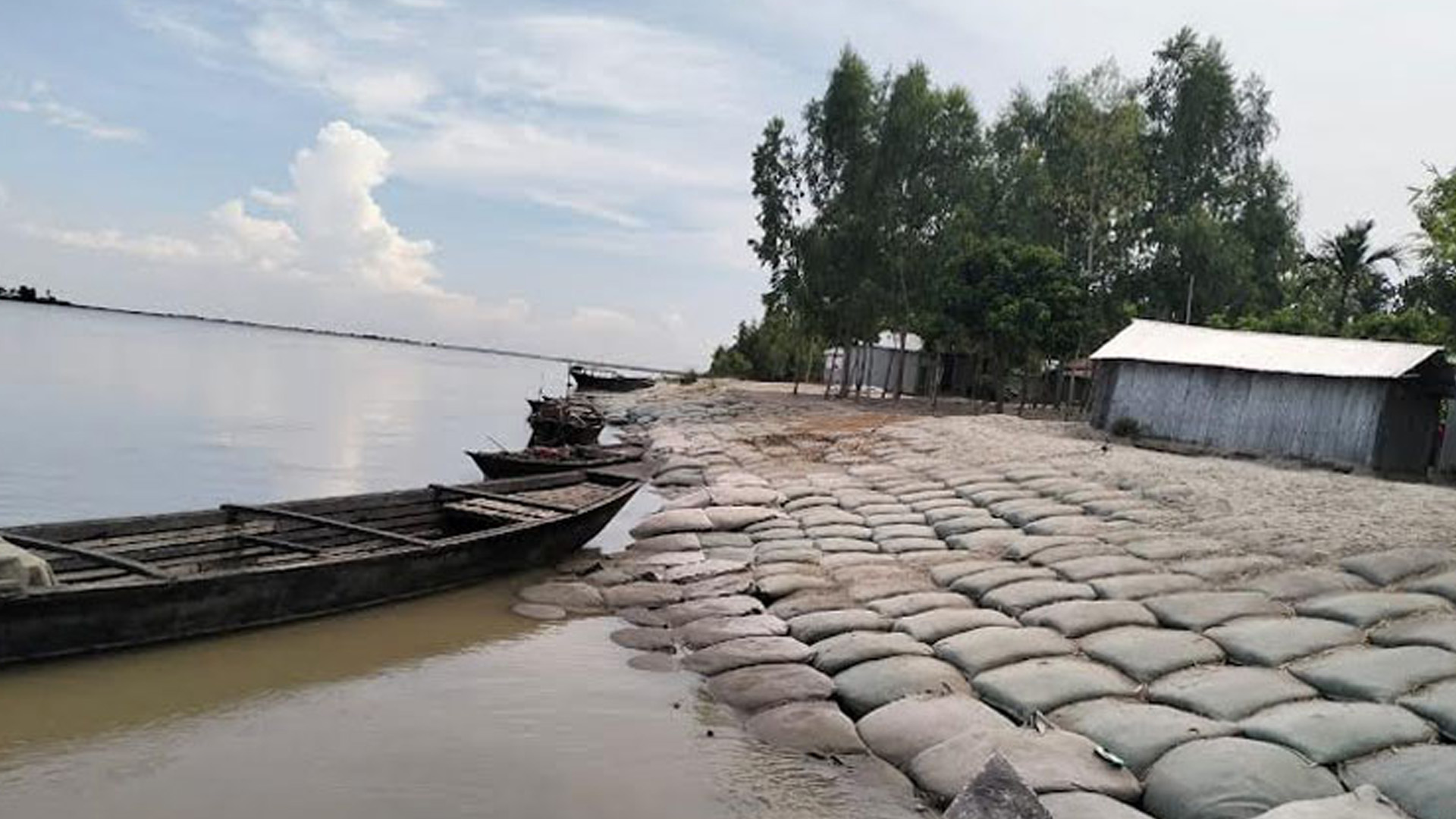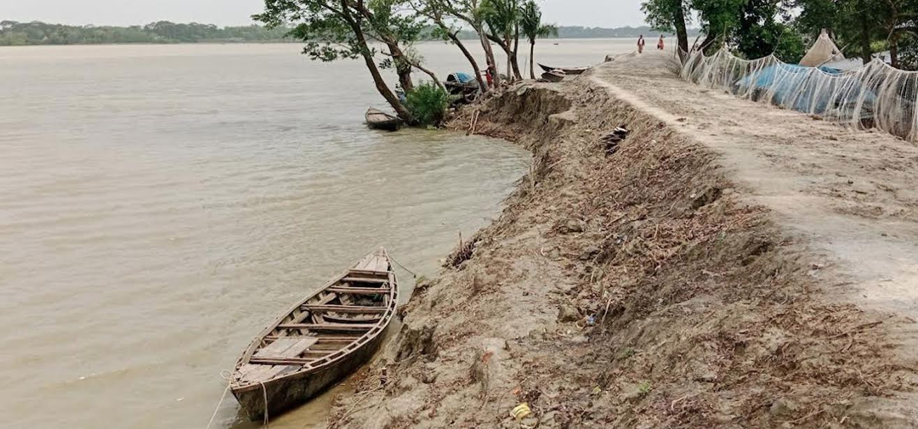 বর্ষায় নদীর পাড় ভাঙে, এতে বসতবাড়ি, কৃষিজমি ও গাছপালা হারিয়ে যায়।