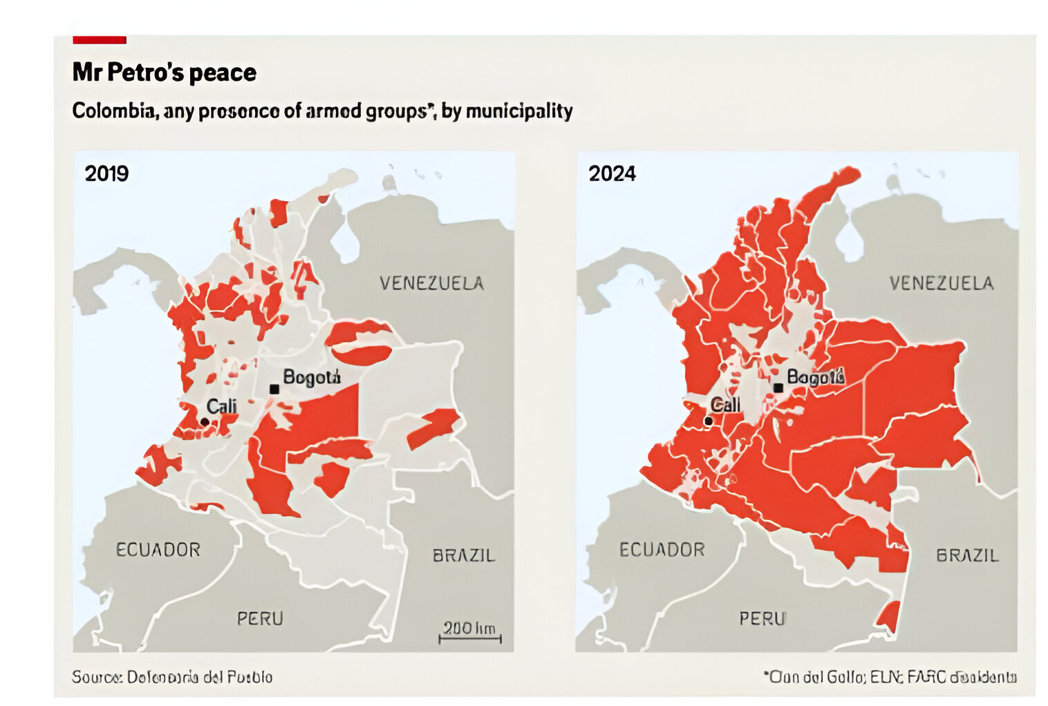 প্রেসিডেন্ট পেত্রোর “পাজ টোটাল” বা সর্বমোট শান্তি পরিকল্পনা কার্যত ভেস্তে গেছে। বিদ্রোহী নাম ব্যবহার করলেও এসব গোষ্ঠী মূলত মাদক ব্যবসায়ী। তারা যুদ্ধবিরতির সুযোগে নতুন এলাকা দখল, অস্ত্র সংগ্রহ ও সদস্য নিয়োগ করছে। বর্তমানে সশস্ত্র গোষ্ঠীর সদস্য সংখ্যা প্রায় ২২ হাজার — পেত্রো ক্ষমতায় আসার পর যা ৪৫ শতাংশ বেড়েছে। জাতিসংঘের হিসেবে সহিংসতায় বাস্তুচ্যুত মানুষের সংখ্যা আরও ২ লাখ ৩০ হাজার।