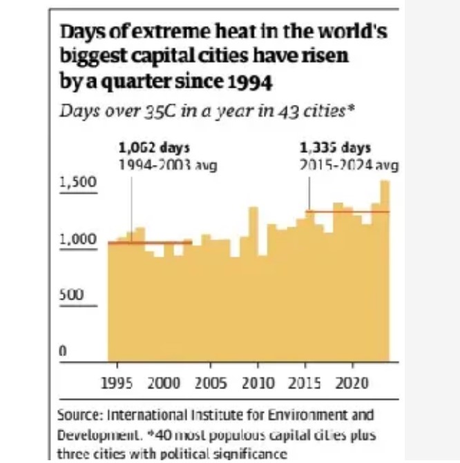 আন্তর্জাতিক পরিবেশ ও উন্নয়ন ইনস্টিটিউটের (IIED) গবেষণা বলছে, বিশ্বের ৪৩টি জনবহুল রাজধানীতে ৩৫ ডিগ্রি সেলসিয়াসের ওপরে গরমের দিন ১৯৯৪ থেকে ২০০৩ সালের মধ্যে বছরে গড়ে ছিল ১,০৬২ দিন। ২০১৫ থেকে ২০২৪ সালে তা বেড়ে দাঁড়িয়েছে ১,৩৩৫ দিনে।