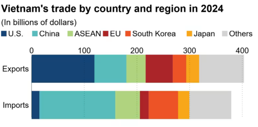 চলতি বছরের গ্রীষ্মে ভিয়েতনাম যুক্তরাষ্ট্রের সঙ্গে একটি বাণিজ্য চুক্তির কাছাকাছি পৌঁছেছিল। কিন্তু ট্রাম্পের হঠাৎ শুল্ক ঘোষণায় তা ভেস্তে যায়। মার্কিন সংবাদমাধ্যম পলিটিকো জানায়, ভিয়েতনামী আলোচকরা ভেবেছিলেন শুল্ক হবে প্রায় ১১ শতাংশ, কিন্তু ট্রাম্প ২০ শতাংশ ঘোষণা করায় বড় ধাক্কা খেয়েছে হ্যানয়। প্রেসিডেন্ট আরও দাবি করেন, এর বিনিময়ে ভিয়েতনাম যুক্তরাষ্ট্রের পণ্যে শূন্য শতাংশ আমদানি শুল্ক দেবে।