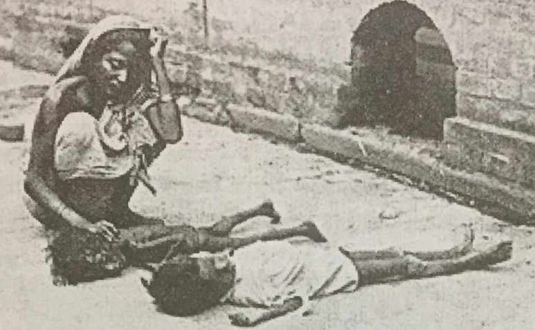 ক্ষুধার্ত মা, এক শিশু সন্তান মারা গেছে, দ্বিতীয়জন মারা যাচ্ছে। সৌজন্যে: দি স্টেটসম্যান, কোলকাতা, ২২ আগস্ট, ১৯৪৩ সাল; উইকিমিডিয়া কমনস; পাবলিক ডমেইন।