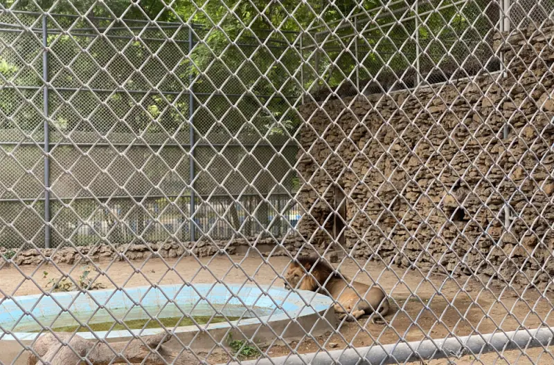 একটি সিংহ নিথর হয়ে শুয়ে আছে। আধখোলা চোখে গভীর ক্লান্তি—যে ক্লান্তি কেবল বন্দিত্বই দিতে পারে।