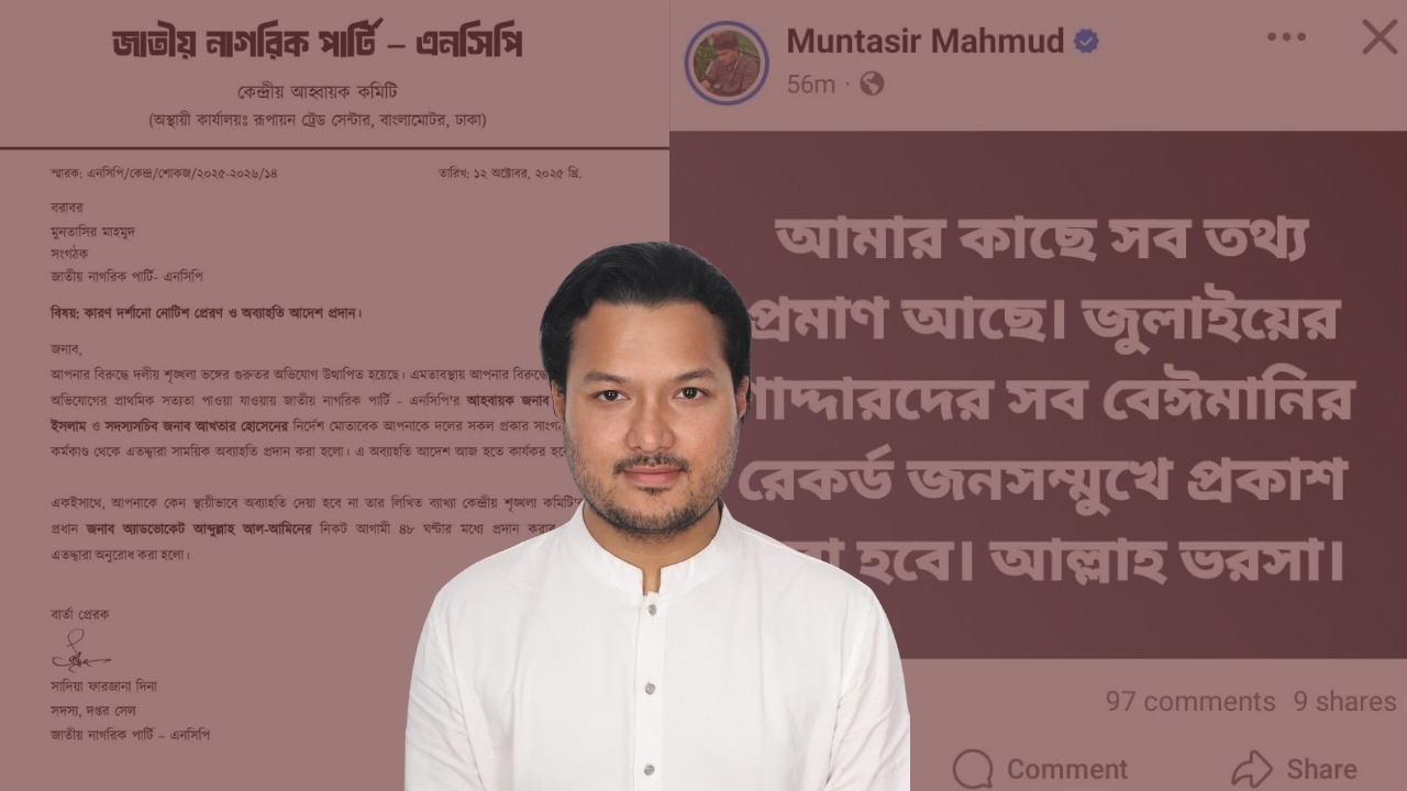 দলীয় শৃঙ্খলা ভঙ্গের অভিযোগে মুনতাসির মাহমুদকে এনসিপি থেকে সাময়িকভাবে অব্যাহতি দেওয়া হয়েছে। একই সঙ্গে তাকে কারণ দর্শানোর নোটিশও পাঠানো হয়েছে।
