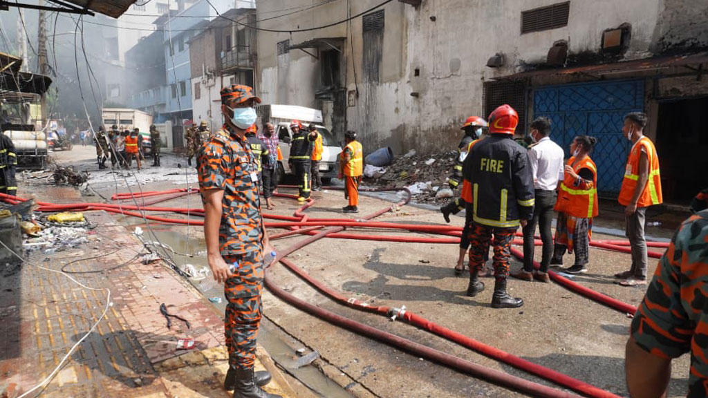আগের দিন মঙ্গলবার সকাল থেকে দমকল বাহিনীর সদস্যরা ঘটনাস্থলে কাজ করছিলেন। মঙ্গলবার পোশাক কারখানার অংশে আগুন নিয়ন্ত্রণে এলেও কেমিক্যাল গুদাম ‘আলম ট্রেডার্স’-এ আগুন জ্বলতে থাকে এবং তা বুধবার দুপুরে নিয়ন্ত্রণে আসে।