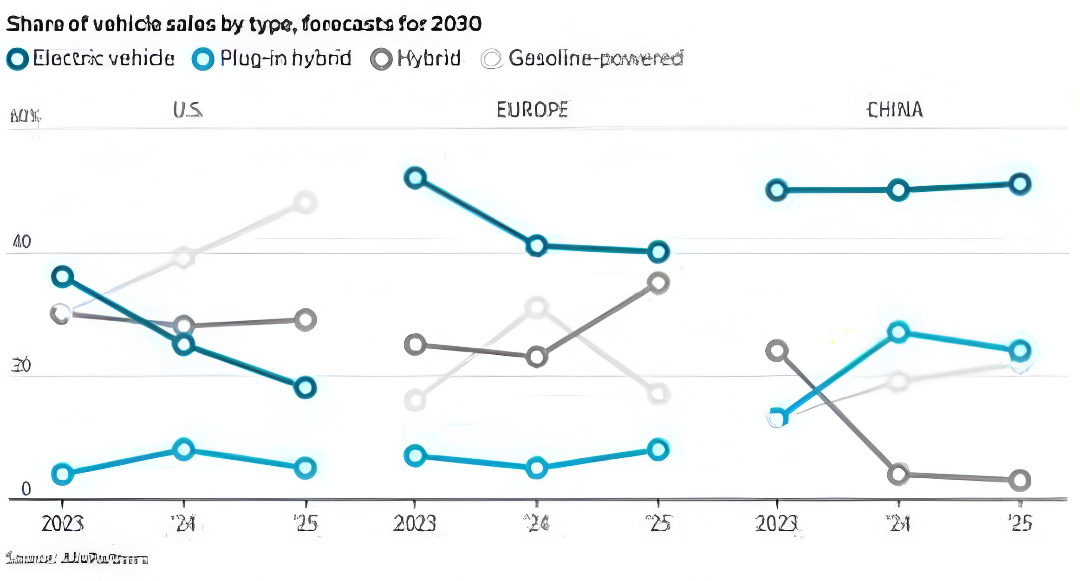 • ক্যালিফোর্নিয়ার নিজস্ব নির্গমন মান নির্ধারণের ক্ষমতা বাতিল করা - • অ্যালিক্সপার্টনার্সের পূর্বাভাস অনুযায়ী, ২০৩০ সালে যুক্তরাষ্ট্রে নতুন যানবাহনের মাত্র ১৮% হবে ইলেকট্রিক—যা আগের পূর্বাভাসের অর্ধেক।